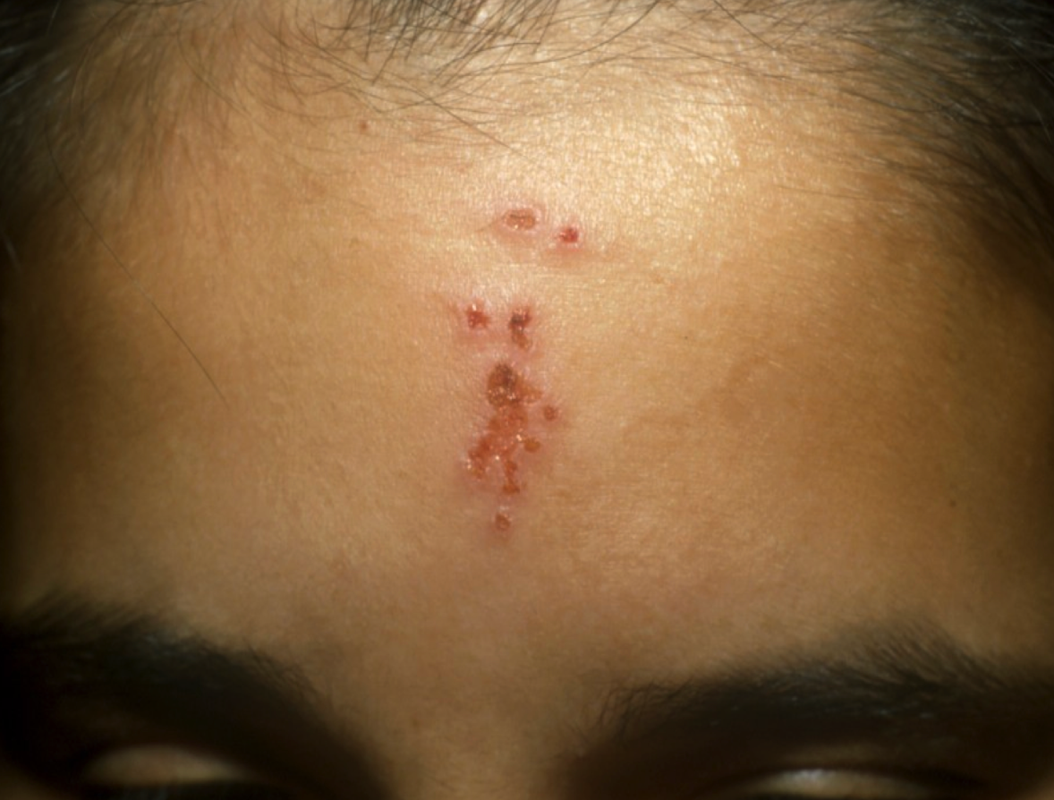 A girl aged 15 years presented with a 4-month history of recurrent crusted lesions on her forehead (Figure). According to her mother, the initial lesions were blackheads from her acne. She had occasional breakouts, which evolved into more widespread hyperpigmented and crusted papules. Her mother says that the patient was increasingly preoccupied with her facial appearance and often picked at her skin in front of a mirror. The patient also acknowledged compulsive picking behaviors, especially during periods of stress or academic anxiety, often without full awareness of the behavior, and acknowledged feelings of relief afterward, followed by guilt.