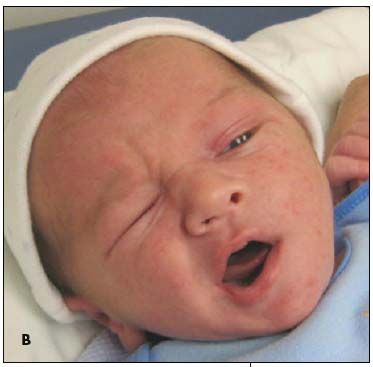 Vital signs normal. Weight, 3.51 kg; length, 49.5 cm; and head circumference, 34 cm. At rest, the infant's facial features appeared symmetric (A), with no bruising or obvious trauma. When he cried, the lower lip on the left side did not depress, the left eyelids remained open, the forehead and eyebrow did not wrinkle, and the nasolabial fold on the left was flat (B). He had normal suck and swallow reflexes and did not drool.