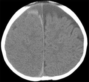 By the time these results were returned, a large hematoma was noted at the site of the blood draw. The infant’s condition was changing rapidly and a CT scan of the head was ordered. The scan revealed a large left parietal intraparenchymal hemorrhage (Figure). Edema was noted and a midline shift, with no herniation.