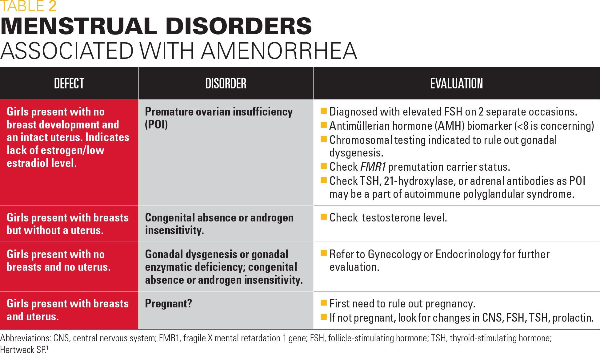 Hertweck particularly underscored the need to understand what normal is in terms of age of onset, frequency, and flow as pediatricians and patients can misinterpret what may indicate an abnormality as simply an irregularity. On average, she says, menarche begins at age 12 years and begins 2 to 3 years after breast budding. “If a girl has a breast bud at age 10 and doesn’t have a period at age 14, something is wrong,” she says. “When you get 3 years out from breast budding and no period, you need to follow up on that.” Table 2 lists what pediatricians should watch for as indicators of abnormal menarche or onset of menses. Girls with these indicators are considered to have primary amenorrhea.