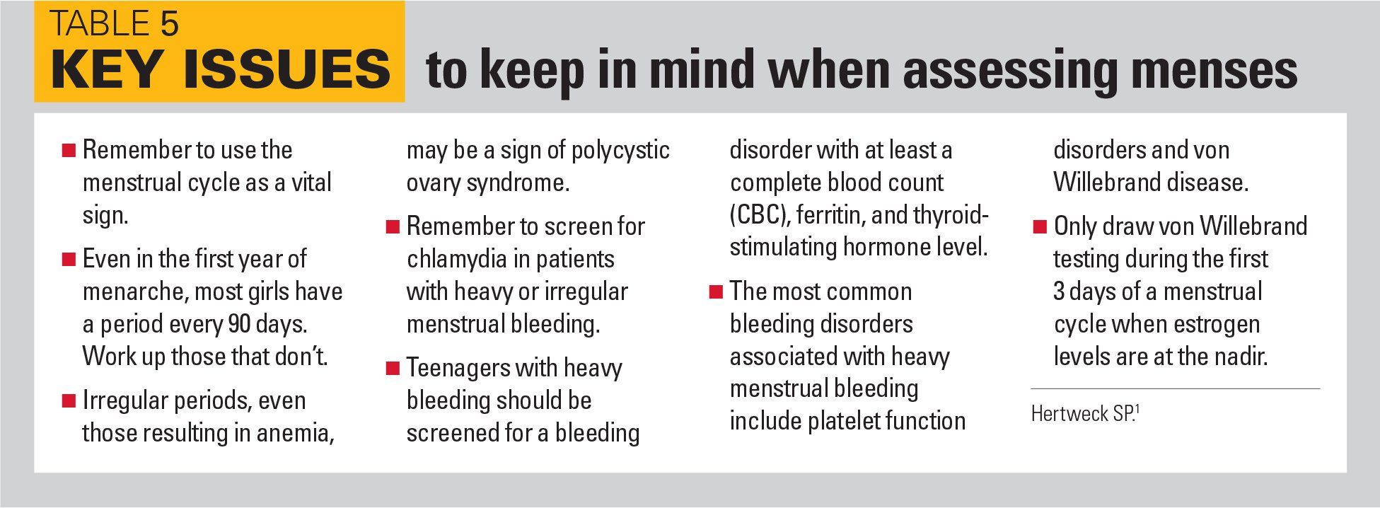 Girls who present with abnormal flow (ie, menorrhagia) should be screened for both a bleeding disorder as well as chlamydia. Hertweck emphasizes that up to 50% of girls with heavy periods could have von Willebrand disease. Another common bleeding disorder to consider is a platelet function disorder. “At a minimum, the pediatrician should check a complete blood count (CBC), ferritin level, and TSH level in girls presenting with heavy menstrual flow,” she says.