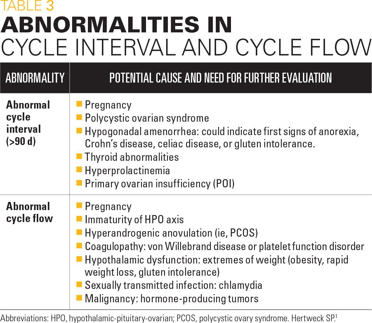 For girls who have abnormal cycle intervals and/or abnormal cycle flow, further workup is needed to uncover the potential cause. Table 4 lists common causes of abnormal cycle intervals and flow that need further evaluation.