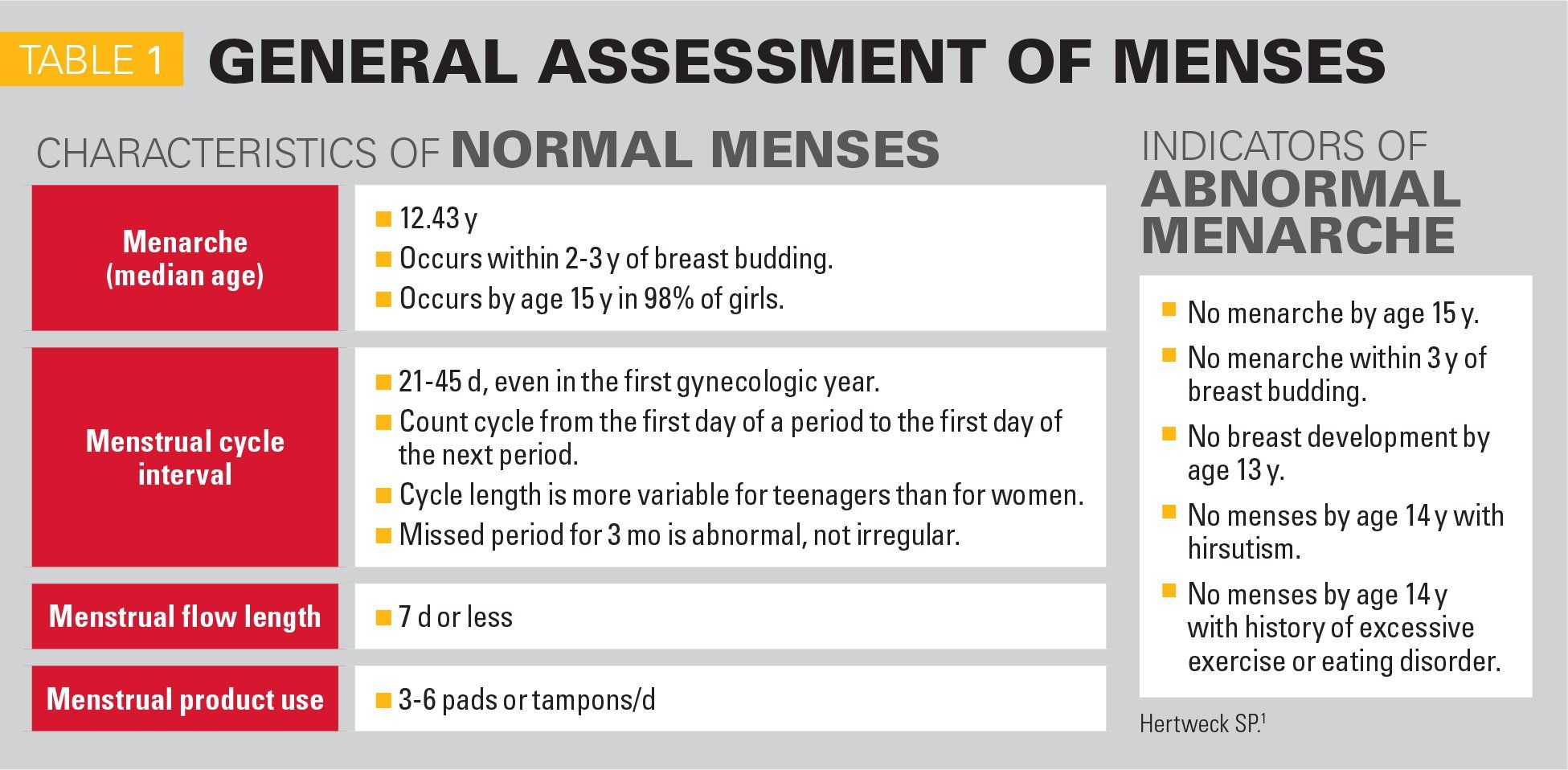 In terms of frequency, Hertweck emphasizes that a normal menstrual cycle runs between 21 to 45 days. Although some periods can be irregular, they rarely fall outside this normal range. In particular, she points out the need to follow up on girls who have missed their period for 90 days. “I think pediatricians can get lulled into the fact that some girls just have periods that are irregular during the first 3 years,” she says. “Yes, periods that range between the 21- to 45-day cycle are acceptably irregular, but if a girl hasn’t had a period for 3 months, you have to ask what is going on,” she says.