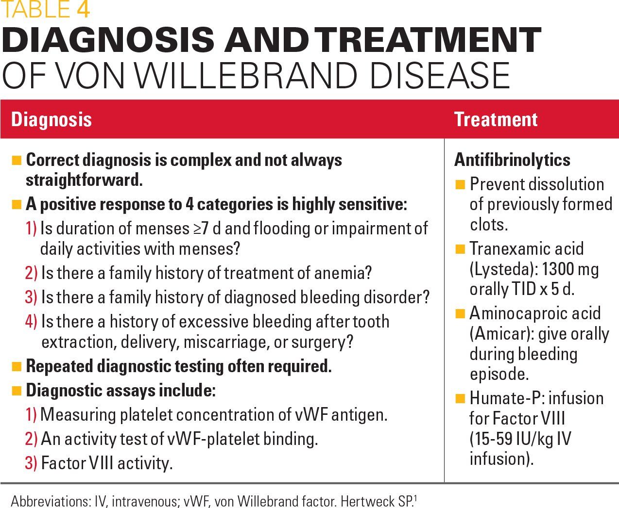 Hertweck notes one example of management of a common bleeding disorder among girls who present with heavy bleeding is for von Willebrand disease (vWD). Table 5 lists the workup for this disease. Hertweck emphasizes that testing for vWD should be done only during the first 3 days of the menstrual cycle when estrogen levels are at the nadir. If a diagnosis of vWD is made or considered, the patient should be comanaged with hormonal and hematologic medications often via consultation with Gynecology and Hematology.