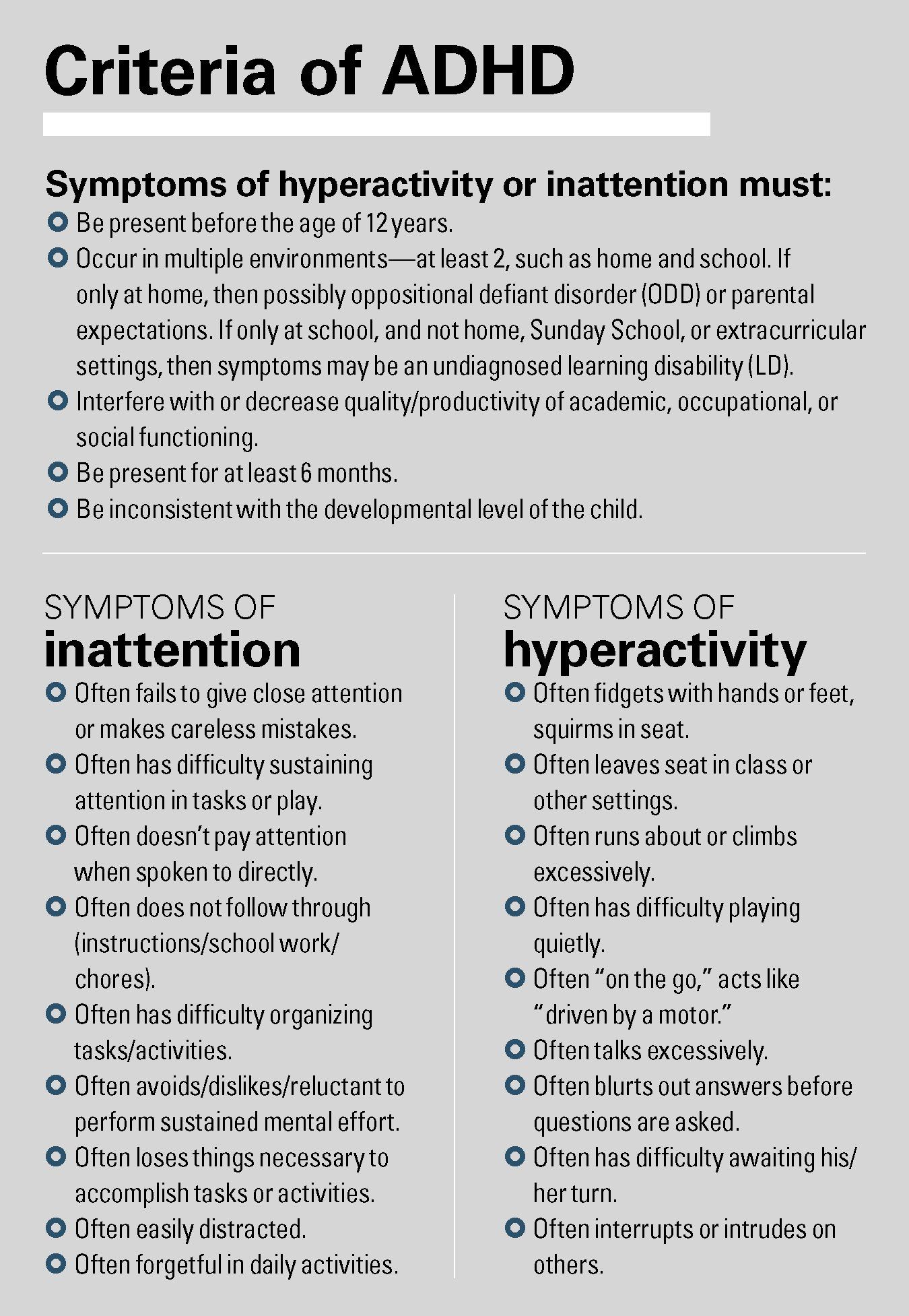 Whereas most pediatricians understand the diagnostic criteria, the DSM-5 expanded the age of symptom onset from prior to age 6 years to prior to age 12 years, in recognition of the later presentation of inattentive symptoms. Additionally, the DSM-5 also recognizes the presence of ADHD in adults, and requires 5 symptoms of the inattentive subtype or the hyperactive-impulsive subtype for diagnosis.