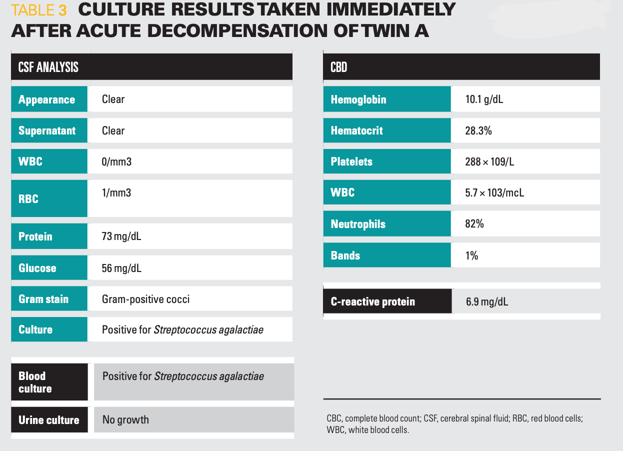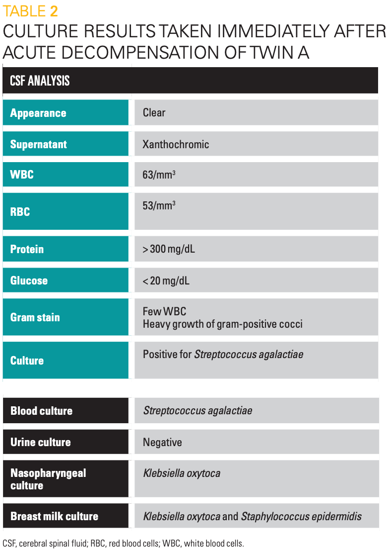Twin A was transferred to NICU-A, the highest acuity unit, where he continued to get worse. Blood and cerebral spinal fluid (CSF) cultures resulted positive for Streptococcus agalactiae, GBS (Table 2). He was confirmed to have GBS meningitis and sepsis; antibiotics were appropriately switched to penicillin G with gentamicin for synergy. Septic shock and disseminated intravascular coagulation symptomatology ensued. He required ample pressure support and multiple transfusions of packed red blood cells (PRBCs), platelets, and fresh-frozen plasma, as well as a bicarbonate infusion to correct for acidosis. He then developed intractable seizures confirmed on electroencephalogram (EEG), requiring multiple antiseizure medications. Repeat HUS showed evolving right grade 1 IVH. Eventually, he required intubation and mechanical ventilation.