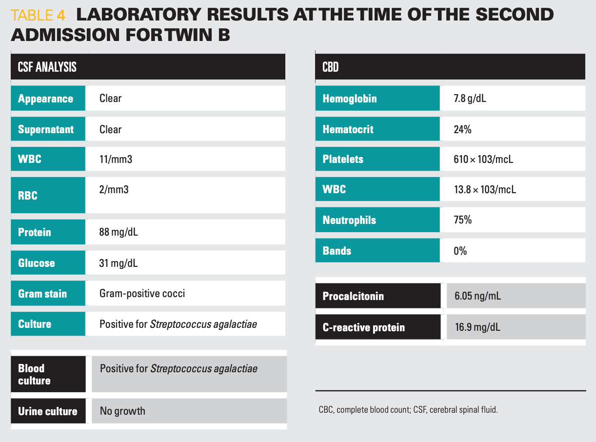 Approximately 4 days after hospital discharge at DOL 29, the mother presented with Twin B to the emergency department (ED) after she seemed more tired than usual with approximately a 5 mL decrease in oral intake per feed and was making grunting noises. On arrival, her vital signs were temperature of 37.2°C, heart rate of 174 bpm, blood pressure of 88/51 mmHg, respiratory rate of 54 breaths per minute, and 100% oxygen saturation on room air. A work-up was performed, including CBC, blood, urine, and CSF cultures (Table 3). Intravenous ampicillin and gentamicin were given empirically, and she was admitted to the pediatric floor.