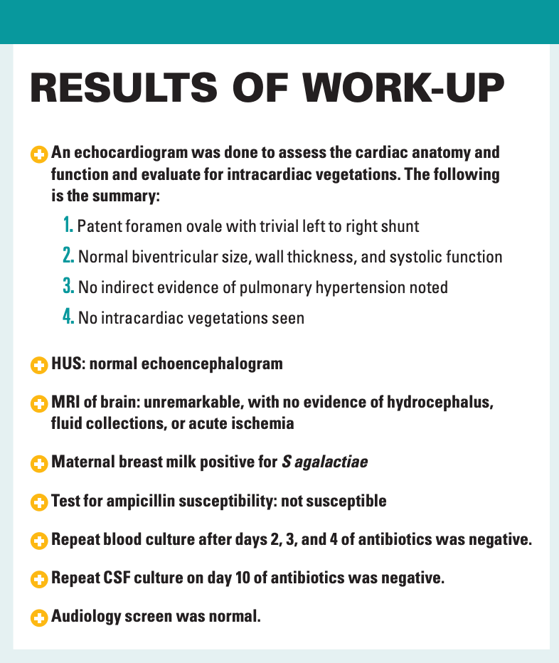 She was admitted from the ED for suspected GBS meningitis and sepsis, which was subsequently confirmed. Pediatric infectious disease was consulted and recommended treatment for 14 days with meningitic doses of ampicillin every 6 hours with 48 hours of gentamicin on-board for a synergistic effect. Her repeat HUS was normal and repeat blood culture after 48 hours of antibiotics and on day 7 of admission were negative. The CSF culture was not repeated based on her clinical status. She was well-appearing throughout her hospital course and was gaining weight at approximately 35 g per day and developing appropriately. Her initial inflammatory marker, CRP of 6.9 mg/dL, declined to 1.2 mg/dL by day 12 of antibiotics. She was discharged home after approximately 2 weeks, now DOL 44, with a follow-up appointment with the pediatrician in 48 hours and audiology.