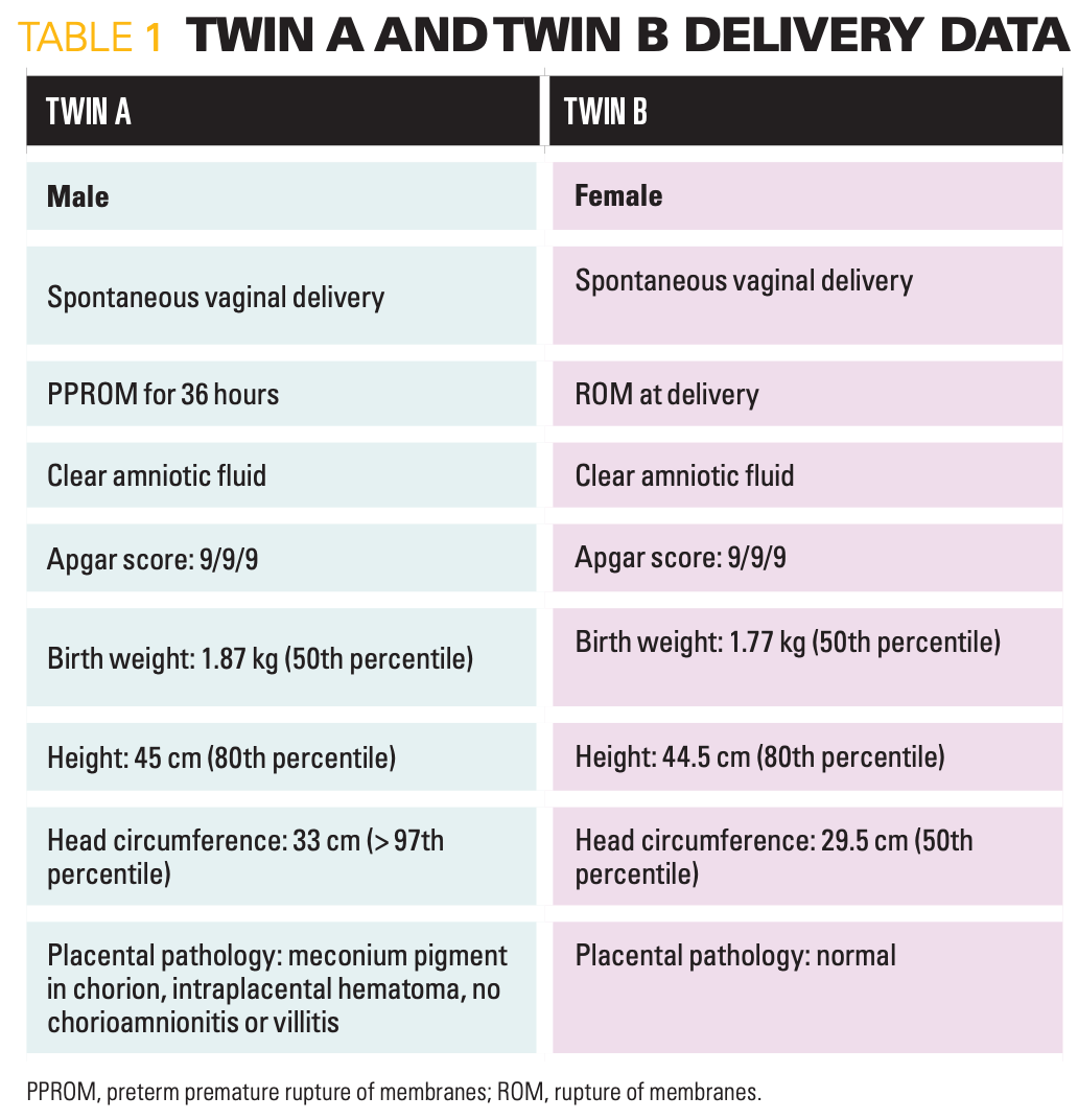 A 29-year-old White woman presented to the labor and delivery unit due to preterm premature rupture of membranes (PPROM). Gestational age was 32 weeks and 2 days by first trimester ultrasound, which correlated with her last menstrual period. That ultrasound also confirmed dichorionic diamniotic twin pregnancy.