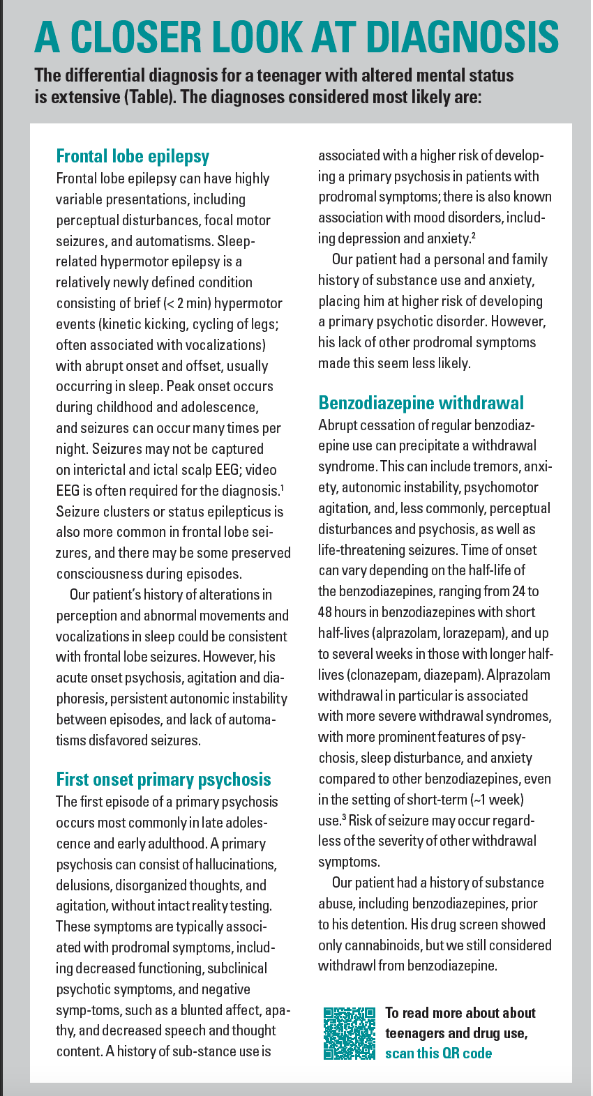 Our patient’s withdrawal was precipitated by incarceration in a juvenile detention center. He and his family indicated that his initial alprazolam use was related to insomnia and anxiety over entering detention while awaiting adjudication for a nonviolent offense. Detained adolescents, who are often awaiting their court date as this patient was, can spend periods of time ranging from days to months in custody. Juvenile detention includes physical and emotional separation from caregivers and communities during a developmentally vulnerable time, as well as exposure to potentially violent and chaotic environments. Detention also may preclude access to what is already limited mental health and substance misuse treatment resources.10