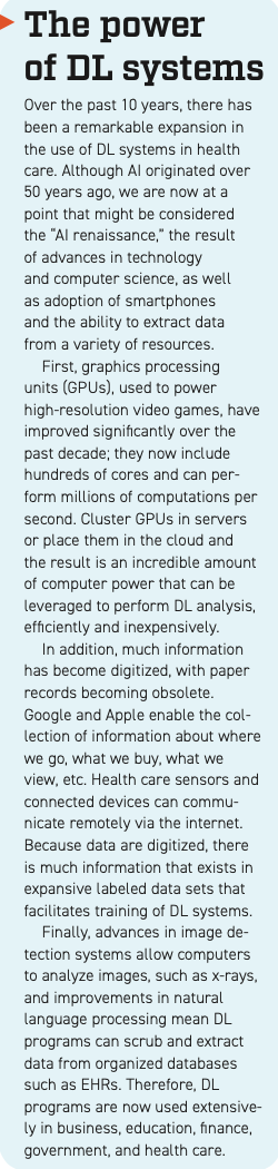 Voice recognition/dictation software is an example of AI that is currently used in pediatric practice. Today, Dragon Medical One from Nuance Communications, the most widely used voice recognition medical software, boasts a vocabulary of 300,000 words and integrates vocabularies for 90 medical specialties. By integrating deep learning (DL), the software covers the nuances of the user’s speech patterns and improves over time, achieving 99% accuracy.1