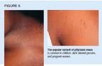 Many times, the lesions themselves, rather than their distribution, assume a different appearance. The papular variant (Figure 5) is most common and tends to occur in children, pregnant women, and dark-skinned people.15 In this form, more classic plaques are interspersed with smaller, pink-brown, rough papules. Older lesions may appear more flat and thickened (lichenoid), resembling pityriasis lichenoides et varioliformis acuta, lichen planus, or a lichenoid drug eruption.