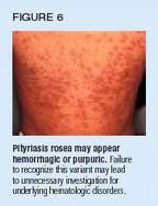 Although pityriasis rosea is a common and familiar eruption, it continues to cause diagnostic dilemmas. Most of us recognize the pink, oval-shaped, scaly plaques that lie along the skin tension lines in a "Christmas tree" pattern and are preceded by a larger "herald patch." This is the classic presentation. Many variations of pityriasis rosea exist, however, both in type and pattern of lesions (Table 7), making recognition of the eruption more difficult.