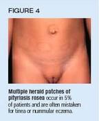 Pityriasis rosea typically affects people between 10 and 35 years of age, although cases have been reported in infants under 1 year and adults over 80 years.15 It can occur in any season but appears to be less common in the summer.15 Only 5% of patients report a prodrome of headache, fever, gastrointestinal symptoms, or malaise.15 It has been estimated that only 80% of patients exhibit a herald patch and classic pattern of lesions.16 Twenty percent of all patients have no herald patch, and 5% have more than one patch (Figure 4).15