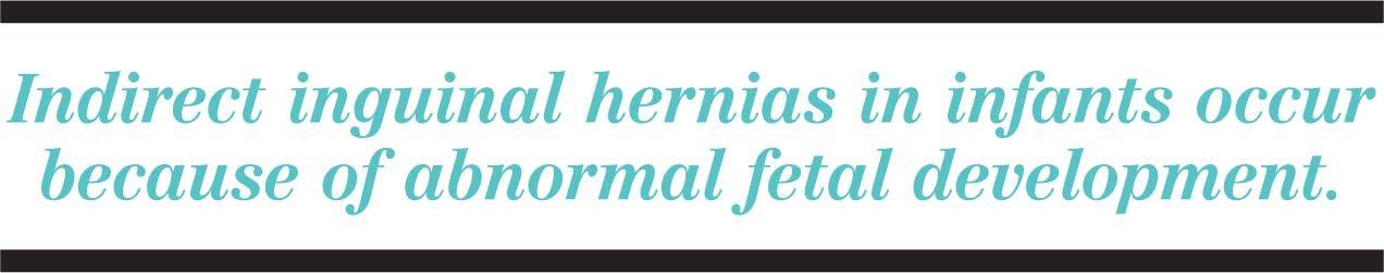 An infant with an inguinal hernia should be thoroughly evaluated to determine whether hernia sac contents are present, because the herniated structures are at an increased risk of incarceration and infarction.1,2 Ultrasound can differentiate direct, indirect, and femoral hernias, as well as differentiate a hernia from other causes of swelling such as a hydrocele or lymph node.3 In an infant presenting with an inguinal hernia, the authors support that ultrasonography be the diagnostic modality of choice. The reported diagnostic accuracy of ultrasound is 93% for acute groin conditions.4