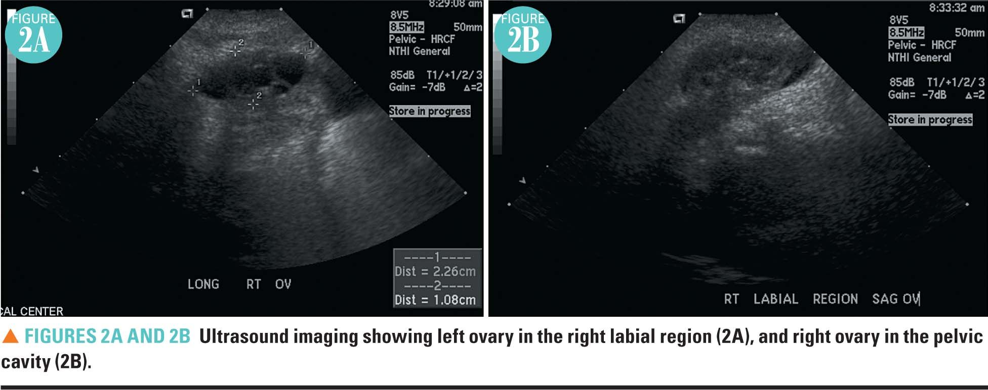 Preoperative ultrasonography demonstrated an unusual finding of an intact right ovary with a suspected herniation of the left (contralateral) ovary into the right labia majora. The left ovary was reported to be incarcerated but not strangulated.