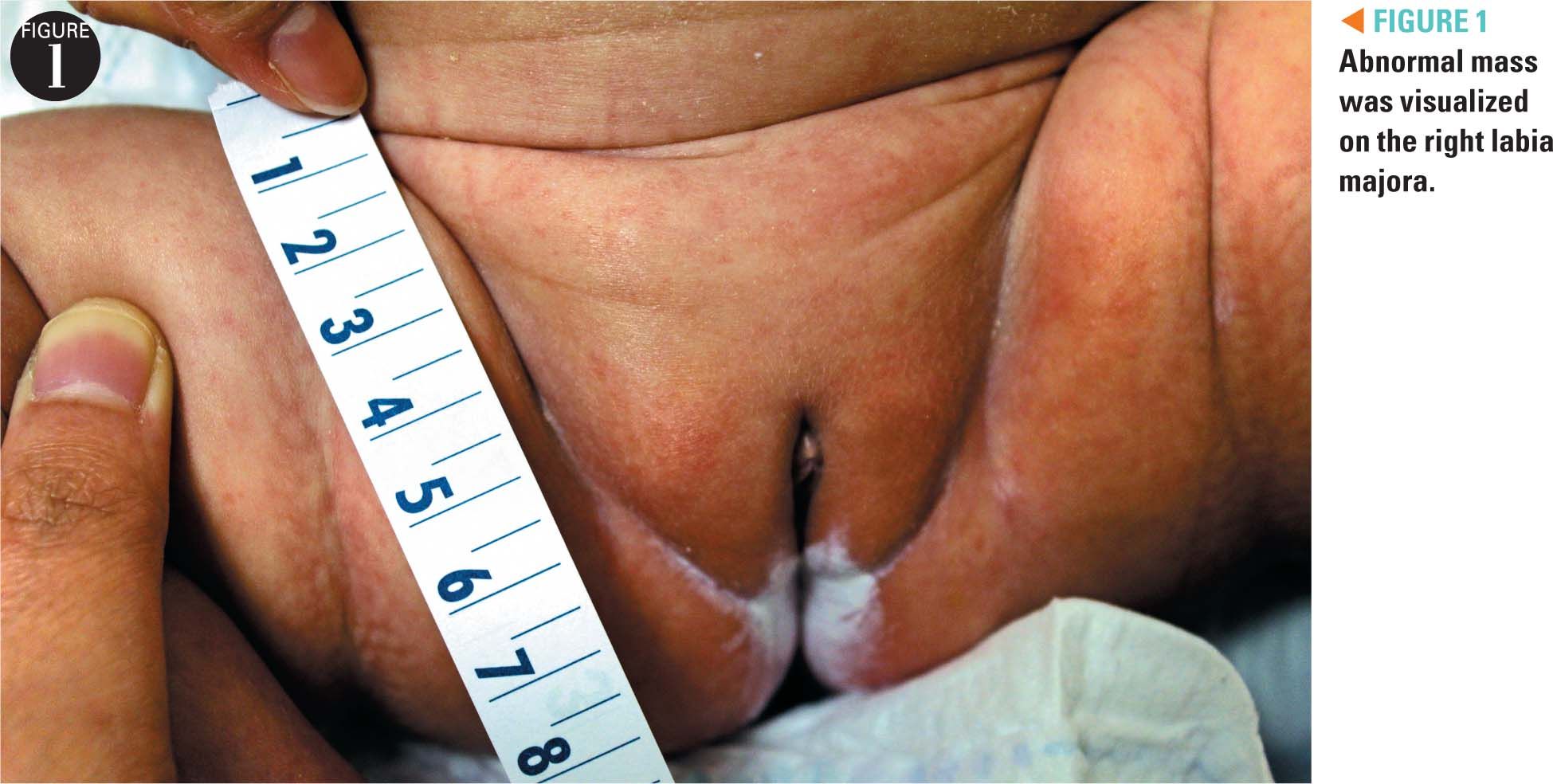 On physical examination, the infant was in no acute distress with normal vital signs. An abnormal 4-cm, soft, bulging mass was visualized on the right labia majora that was nontender, nonerythematous, nonfluctuant, and nonreducible (Figure 1). The patient’s abdomen was soft, nontender, nondistended, and with normal bowel sounds. No signs of bowel obstruction, strangulation, or acute abdomen were noted. A clinical diagnosis of inguinal hernia was made with suspected protrusion of an ovary versus an intraabdominal/pelvic organ, and a pelvic ultrasound was ordered to investigate further.