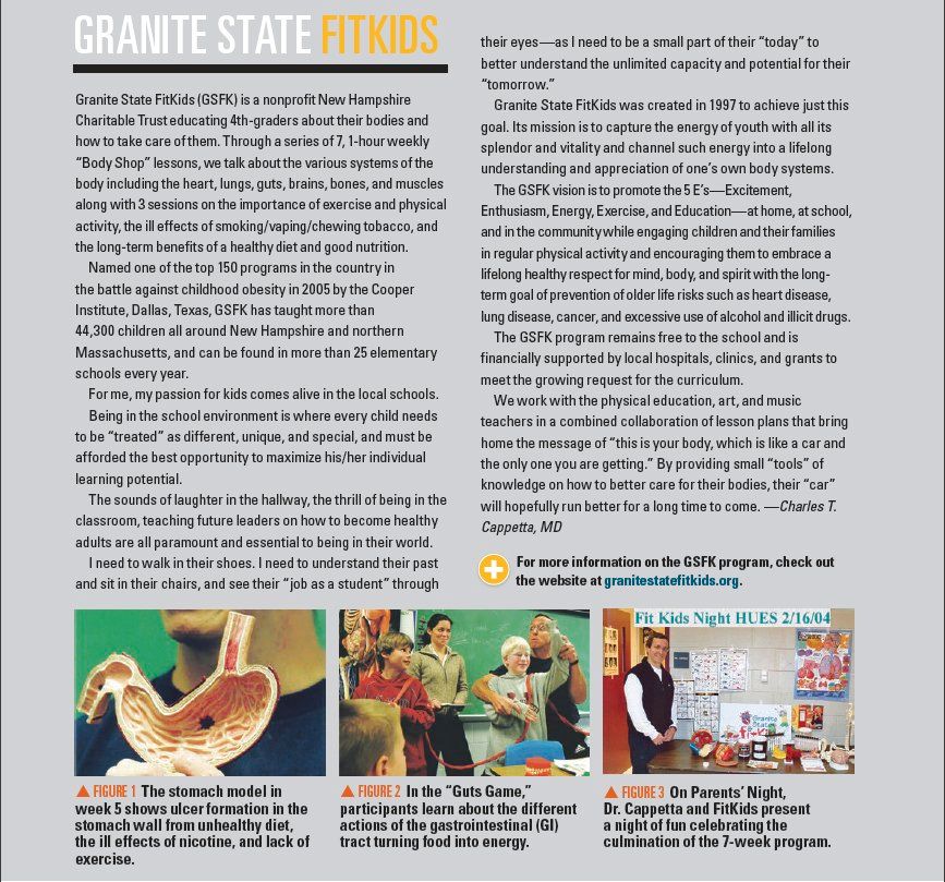 Dr. Cappetta ran a Newborn Father’s Group every 2 weeks for 10 years (1994-2004) for new dads and their infants as a way to help fathers appreciate the important role they play in raising their children. He also has developed a unique education program for children in the Nashua, New Hampshire, school system to stay fit and healthy and has been doing so for more than 23 years (see “Granite State FitKids”). Dr. Schuman recently started a program in his clinic where motivated premedical students can “shadow” him during clinic hours while the student is on summer break.