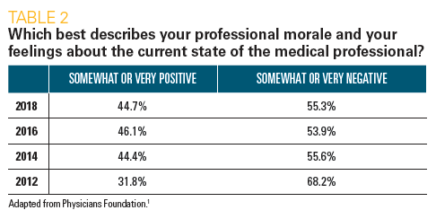 Perhaps most revealing is that 78% of surveyed physicians report they sometimes, often, or always experience feelings of burnout, and over the past few years many physicians feel their morale is worsening (Table 1 and Table 2).