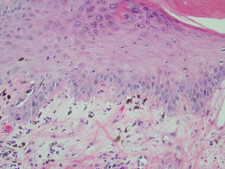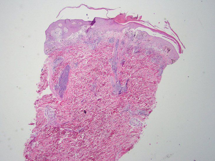 Punch biopsy from the patient’s back revealed prominent vacuolar change at the dermal-epidermal junction with hydropic degeneration of basal keratinocytes and numerous melanophages within the papillary dermis (Figures 3 and 4). Alcian blue staining revealed increased dermal mucin.