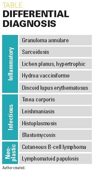 The initial differential diagnosis was broad given the nonspecific clinical presentation without significant symptoms (Table). Whereas granulomatous diseases such as granuloma annulare or sarcoidosis can present as infiltrated annular plaques, they generally lack the scale that is associated with disseminated cutaneous discoid lupus erythematosus (DLE). Lichen planus often has a shiny, violaceous hue, and hydroa vacciniforme often presents as small vesicles that heal with scarred, crusted erosions. Fungal acid-fast bacilli (AFB)and bacterial cultures help to eliminate any infectious etiologies. Biopsy helped to rule in or exclude possible neoplastic processes including cutaneous B-cell lymphoma (CBCL) or lymphomatoid papulosis (LYP). Such neoplasms require clinic-pathologic confirmation.