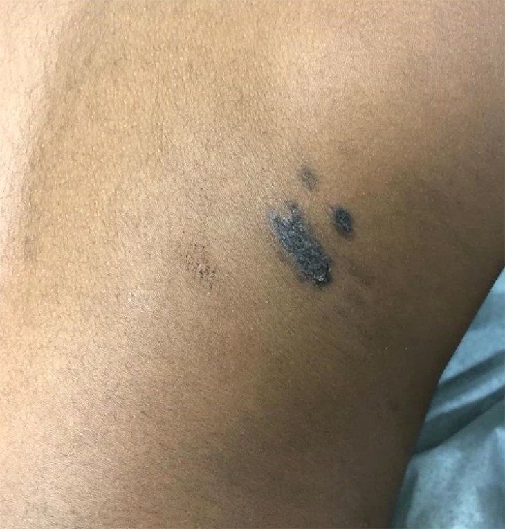 Given the clinical and histologic findings, this patient was diagnosed with DLE as more than one body segment was involved. Shortly after the labs returned, the patient’s mother revealed that she was recently diagnosed with lupus erythematosus (LE). This patient did not fulfill the American College of Rheumatology criteria for systemic lupus erythematosus (SLE) given the absence of laboratory abnormalities and systemic symptoms.