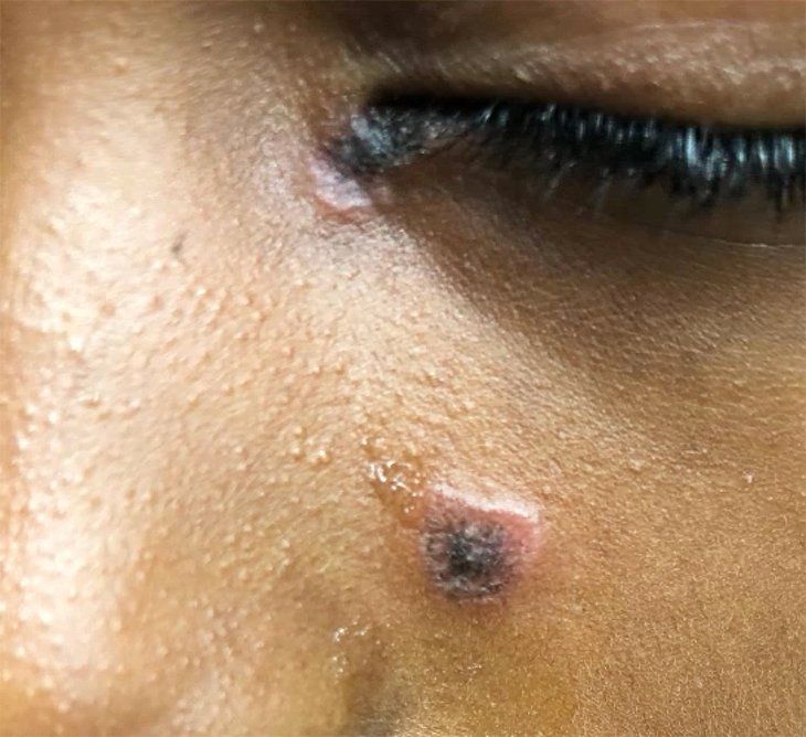 Physical exam revealed well-circumscribed, annular, erythematous plaques with adherent scale and atrophy on the patient’s right forehead, cheeks, bilateral medial canthi, bilateral conchal bowls, and back (Figures 1 and 2). The rest of the physical exam was unremarkable. There was no recent travel, and the patient did not take any medications. There was no evidence of uveitis or arthritis.