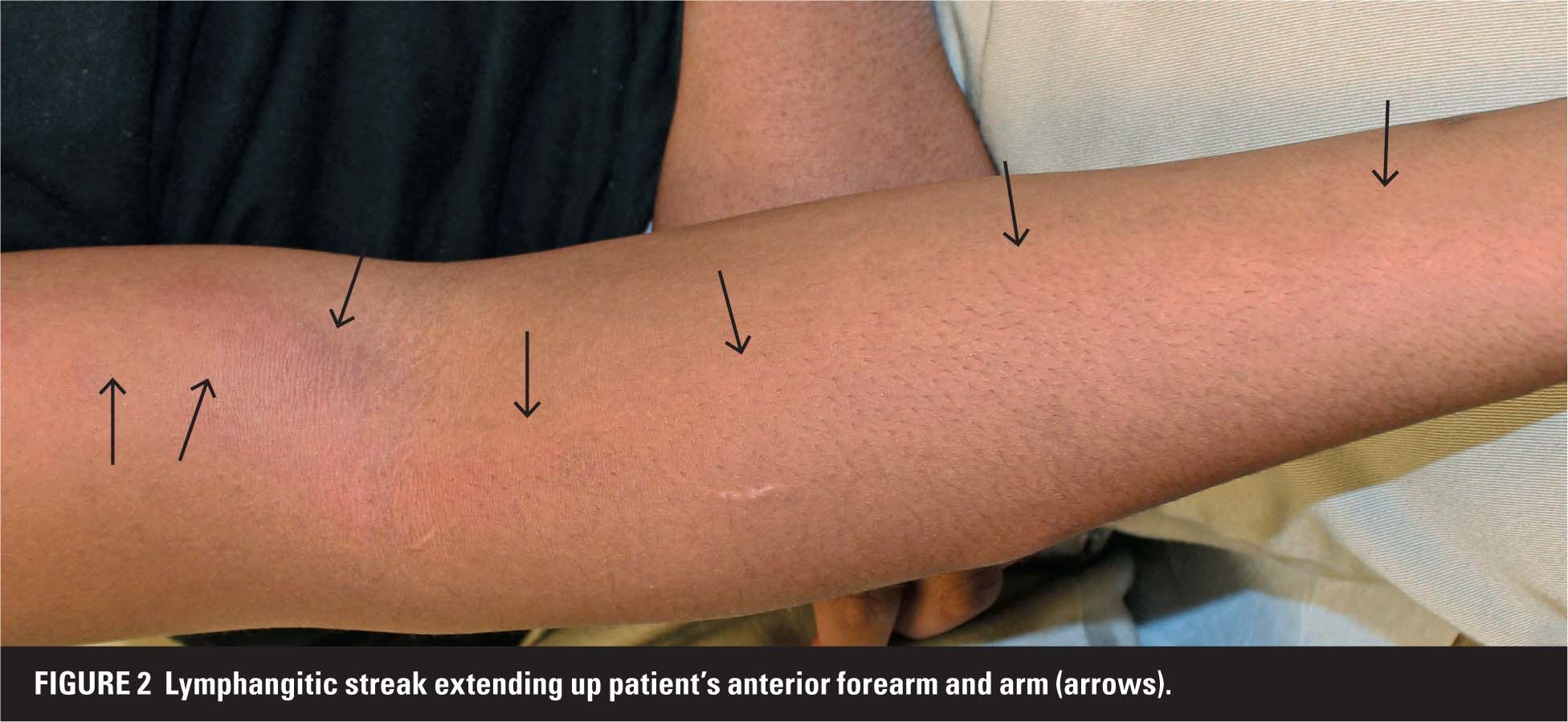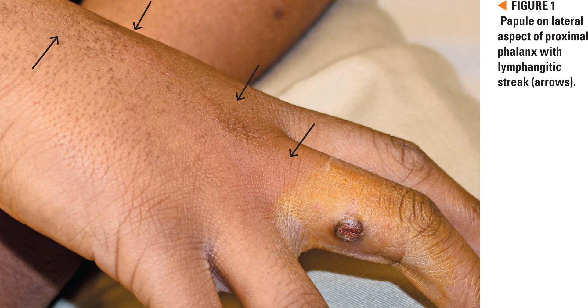 A baffled mother brings her 14-year-old son for evaluation of an asymptomatic bump that appeared on the side of his right third finger 1 week ago. Within the past 24 hours, he developed a long, pruritic, nontender red streak extending from the finger lesion to the upper arm.