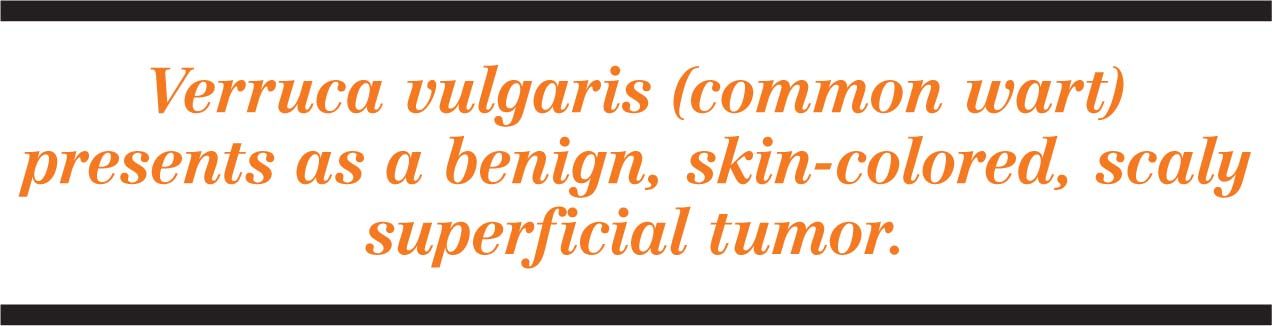 Although over 120 HPV genotypes have been identified and many may be associated with verruca vulgaris, HPV-2 and HPV-4 are the most frequent culprits.6 Transmission of warts can be attributed to direct contact with an HPV-infected person or from a contaminated surface. Human papillomavirus enters epithelial cells through a minor abrasion of the skin surface and attaches to surface receptors.4 Viral infection causes metaplasia of the basal keratinocytes, abnormal keratohyaline granules, epidermal acanthosis, papillomatisis, and hyperkeratosis of the horny layer.5 These histologic changes correlate with localized thickening of the epidermis and the typical clinical lesions. Unfortunately, persistence of the virus after treatment leads to regrowth of a wart.