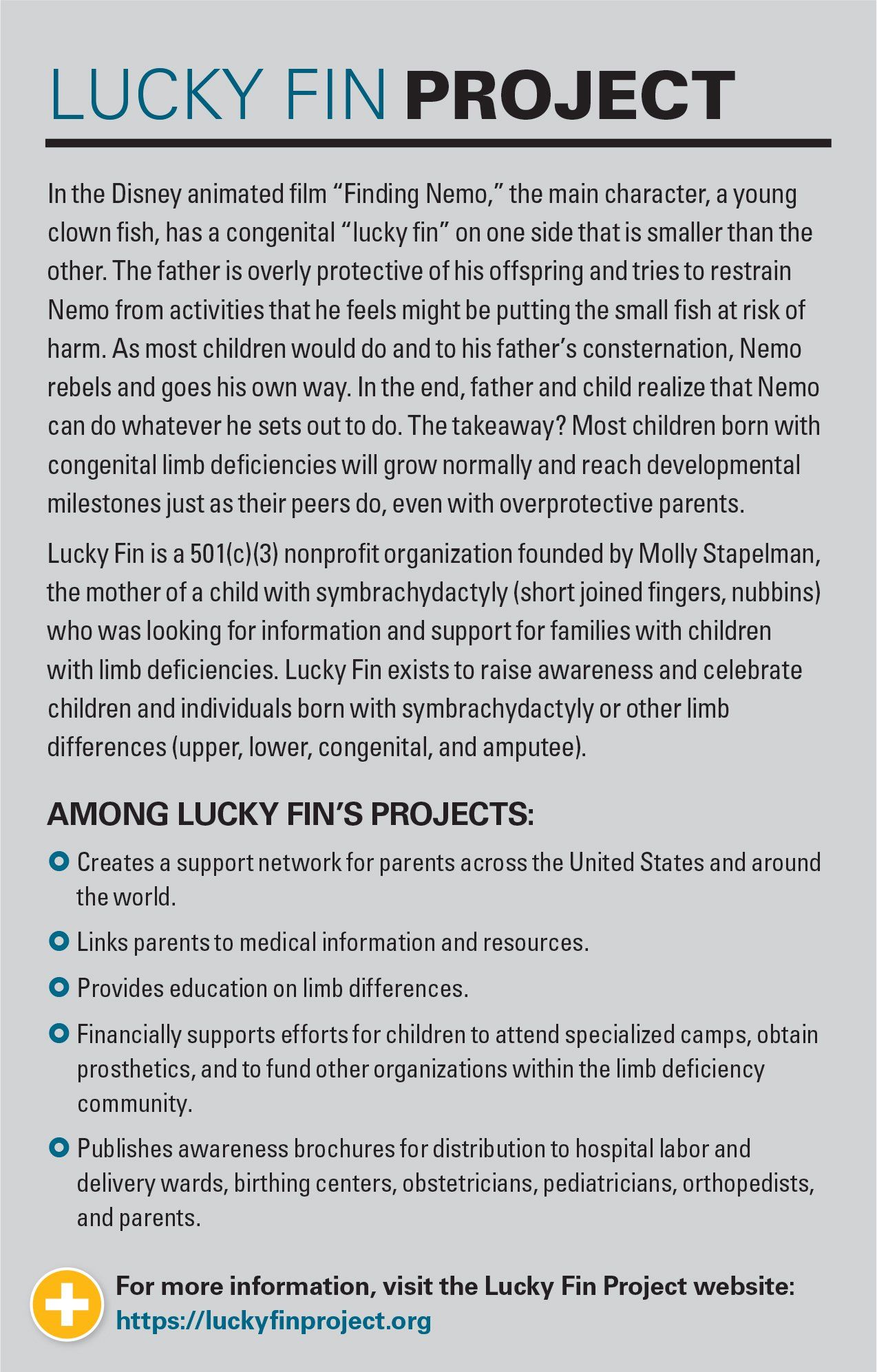 The main goals for primary care providers are to help children develop normally and be independent. Whereas medical support and consultation is important for infants and children with a congenital defect, psychologic support is paramount for the parents and family. The vision of the “perfect child” can cause grief responses, especially if the defect was not suspected. In a historic study by Gringas of children with hand anomalies, the babies’ desire to explore was limited more by the mothers’ anxiety than their functional problem.14 The authors acknowledged children can pick up devaluing attitudes in which the child feels he/she cannot overcome alone. Parents are also noted to be overprotective and project their own distress to the child, which could be detrimental to the growth and development of a child. Parents should be encouraged to treat their children as normal and allow them to make decisions and care for themselves when developmentally appropriate.