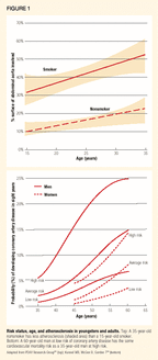 A comparison of the relationship among risk status, age, and atherosclerosis in young people with the relationship among risk status, age, and coronary mortality in adults offers insight into how the presence of risk factors for CAD affects the aging process of the coronary vasculature (Figure 1).11,13 The 15-year-old at high risk of a cardiovascular event because of high LDL levels, low high-density lipoprotein (HDL) cholesterol levels, and smoking has about the same amount of atherosclerosis as the 35-year-old nonsmoker with low LDL levels, and high HDL levels. In the Framingham Study, a long-range follow-up study of adults and their cardiovascular risk factors begun 50 years ago, the 35-year-old at high risk of cardiovascular disease has the same CAD mortality rate as the 60-year-old with no risk factors. Thus, the presence of risk factors, including elevated LDL cholesterol, appears to accelerate the aging process in the coronary vasculature, a process that begins in earnest in the second decade of life.