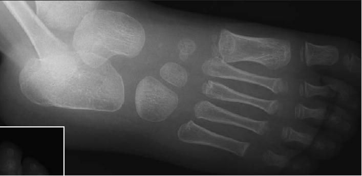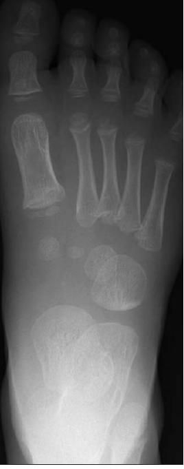 Three-year-old boy limping on right foot after an unwitnessed fall from trampoline the day before. Pain controlled with ibuprofen. No history of chronic diseases or routine medication use.