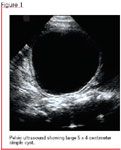 In a female infant of this age, you know a cystic mass in the pelvis is unusual, but very likely an ovarian cyst. The most common cause of a pelvic mass in a female is an ovarian cyst, but generally speaking, the most common cause of abdominal (including flank) mass would be multicystic dysplastic kidney (MCDK). Smaller ovarian cysts will typically disappear by six to nine months of age. However, you also know that larger ovarian cysts need to be closely followed, as they may not spontaneously involute and even have the risk of acute torsion. Finally, you question if this cyst could be something else, such as a mesenteric cyst, duplication cyst, or giant Meckel's diverticulum, as the radiologist cannot fully see the cyst arising from the adnexa.