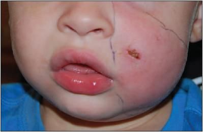 The child was afebrile, alert, and responsive. He had a 1-cm scab in the center of a shiny, swollen, and erythematous area that extended from the lower eyelid to the submandibular region on the left side (outlined in marker). The area was warm to touch and tender on palpation. A 22-cm indurated area was palpable around the scab from which there was mild drainage after manipulation. The child's vaccination history was up-to-date.