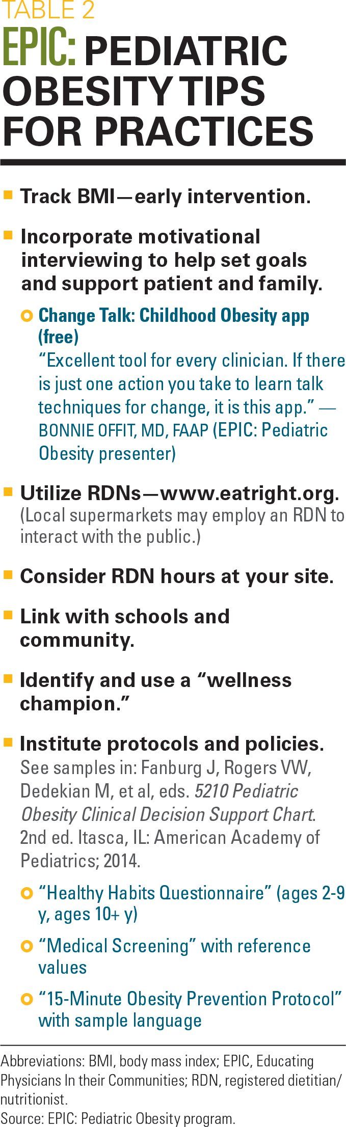 EPIC: Pediatric Obesity educates audiences about how to assess these components, provides tools to assist, and identifies possible interventions. Presenters demonstrate motivational interviewing to develop goals with an individual patient and family. Programs share coding and reimbursement tips. Sites are encouraged to identify a wellness champion who can be the site’s “information center” for local resources on food insecurity, summer feeding programs, physical activity programs, and other obesity-prevention and treatment services.