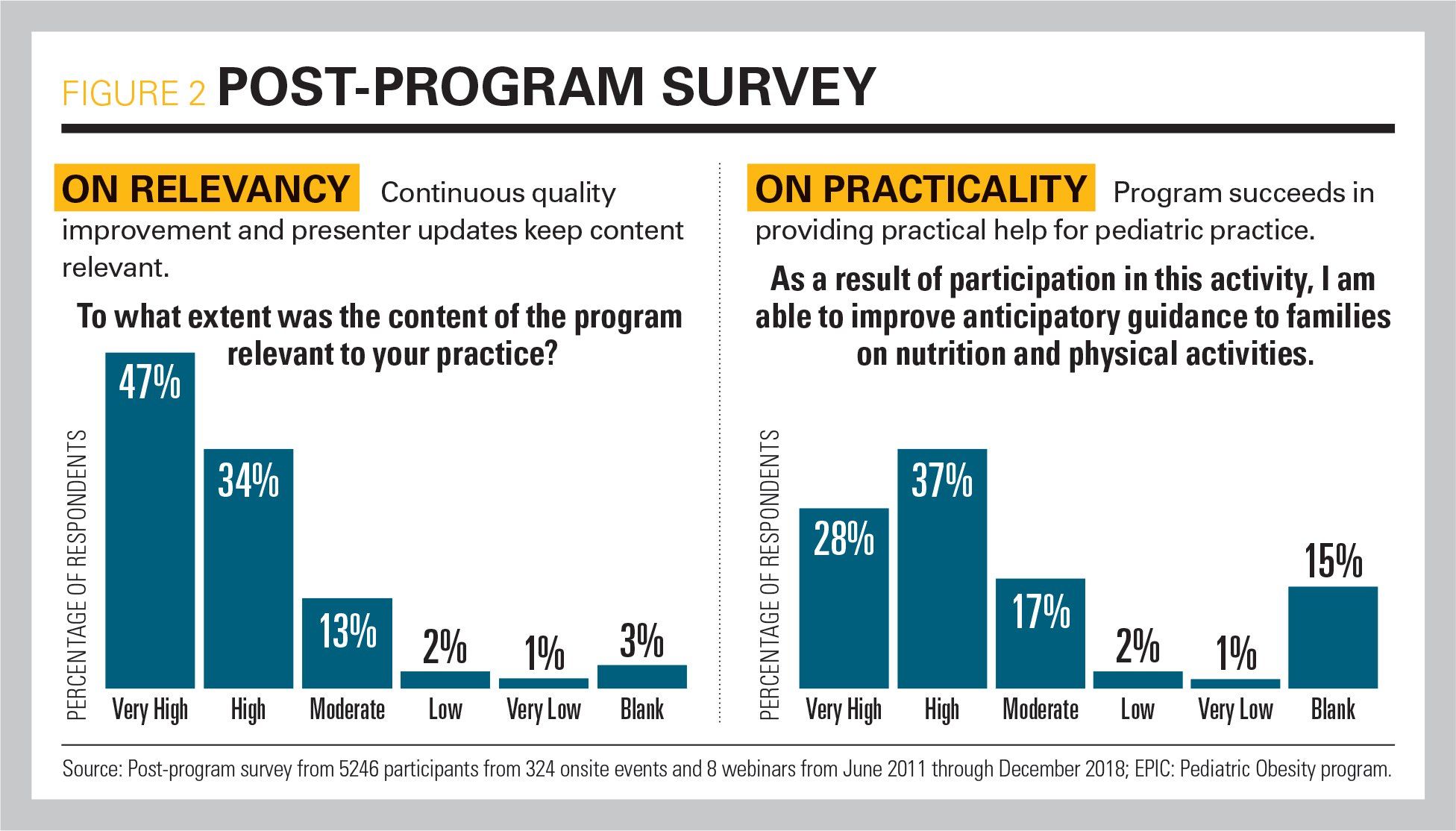 Program participants completed pre-surveys and post-surveys at the time of each live and webinar program. Pretest and posttest data show that EPIC: Pediatric Obesity succeeded in providing relevant interventions to physicians and other healthcare professionals. Participants developed a broader awareness of community-based resources, increased knowledge and skills regarding identifying childhood obesity comorbidities, and broadened their ability to provide anticipatory guidance for families on nutrition and physical activity (Figures 1 and 2.)