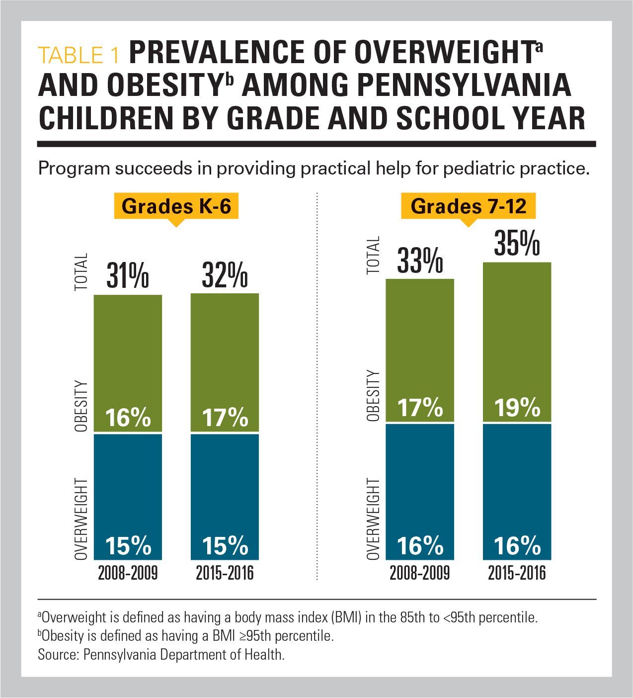 Obesity is a significant health problem for Pennsylvania and the nation. In Pennsylvania in 2017, 31.6% of adults had obesity (BMI, >30), a steady increase since 1990 when the rate was 13.7%. Child and adolescent obesity data mirror the adult outlook, with one-third of children having overweight or obesity (Table 1).