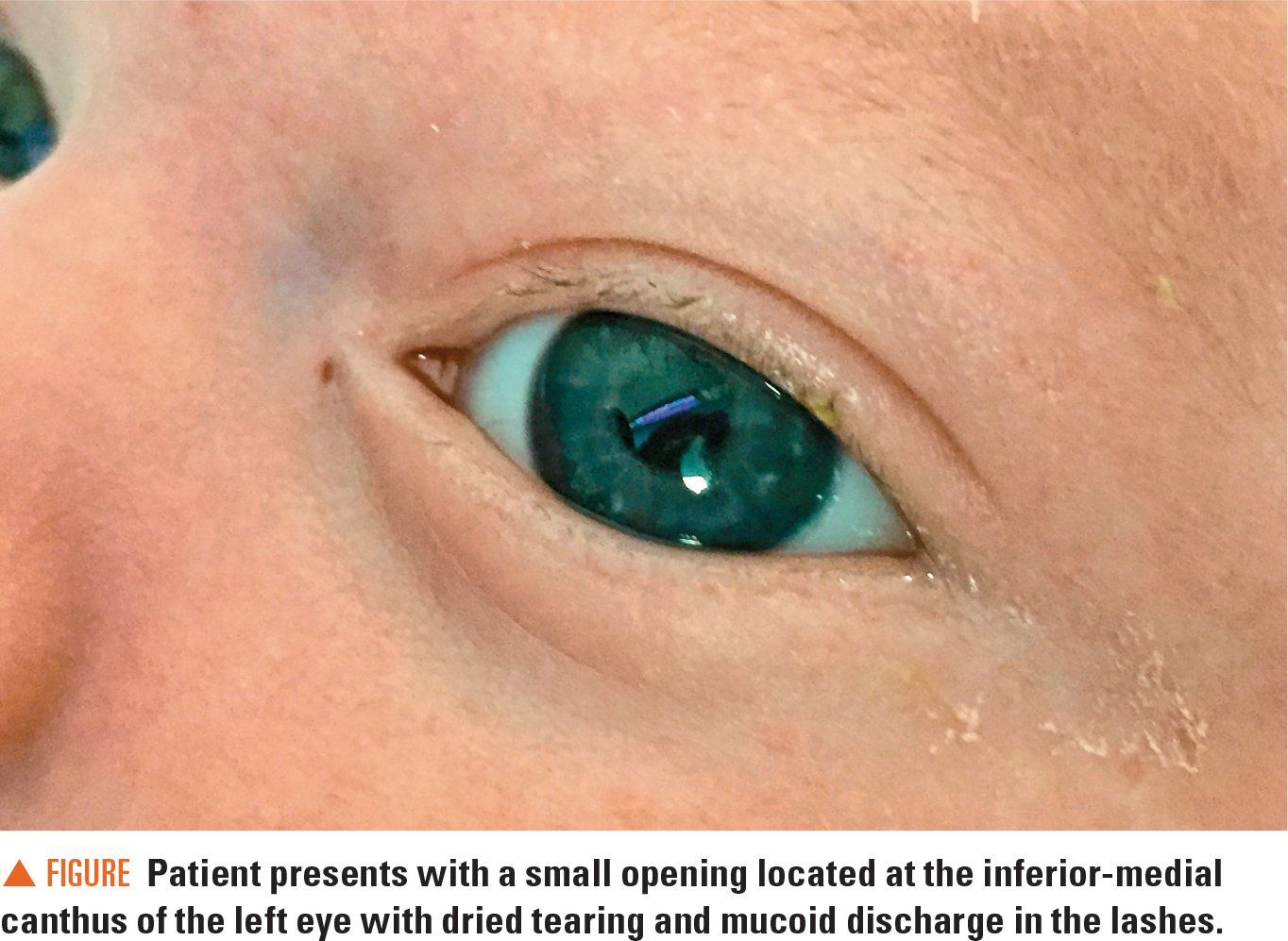 Congenital lacrimal fistulas are mostly asymptomatic; however, there can be complications or undesired symptoms attributed to the fistula. For example, chronic epiphora through the fistula or eye, or mucoid discharge from the fistula, can occur. In addition, coughing and blowing one’s nose may cause clear discharge.1 There also may be redness of medial canthal angle, or constant tearing during crying. A mucocele can be found if associated with nasolacrimal duct obstruction.