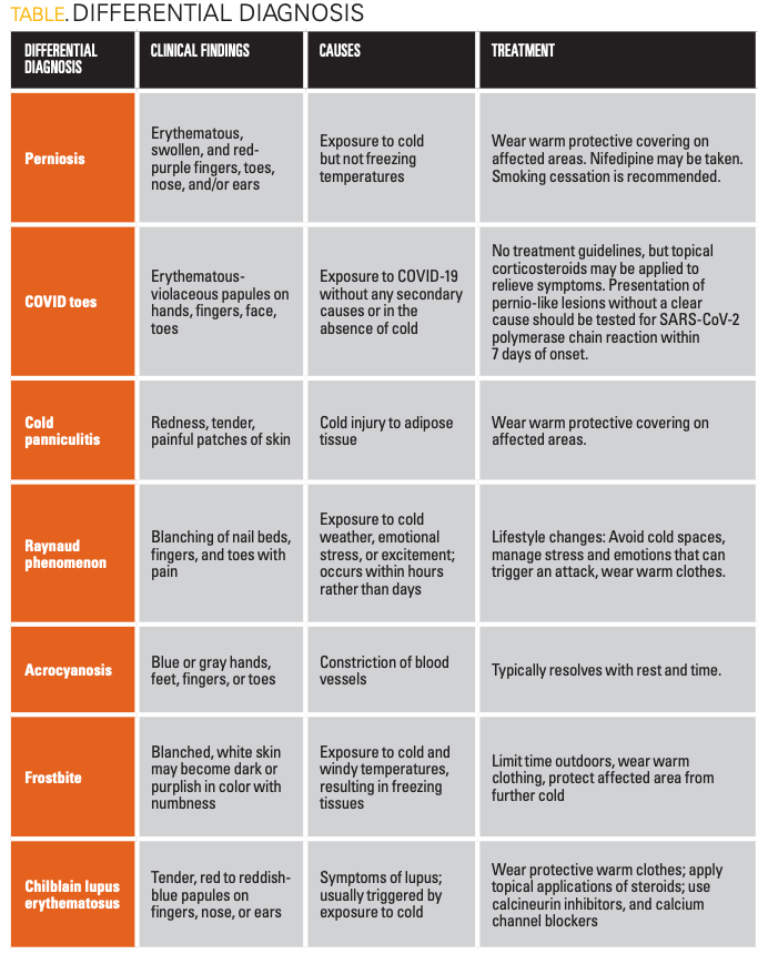 Pernio is a condition that mostly affects children and women, particularly those with a low body mass index (BMI) and who live in a damp, cool, but nonfreezing climate.2 However, it is important to consider other clinical conditions that have a similar clinical presentation to pernio, as described in the Table.