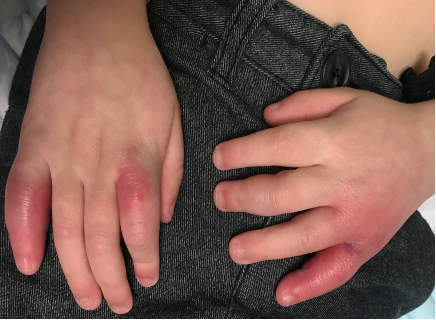 A 4-year-old boy developed edematous, itchy, painful hands and fingers with erythema while playing out in the snow. The most severe involvement was localized to his upper extremities, specifically in his right index and pinky finger and left pinky finger. The child was otherwise healthy with no prior severe medical issues, and he did not present with COVID-19 symptoms.