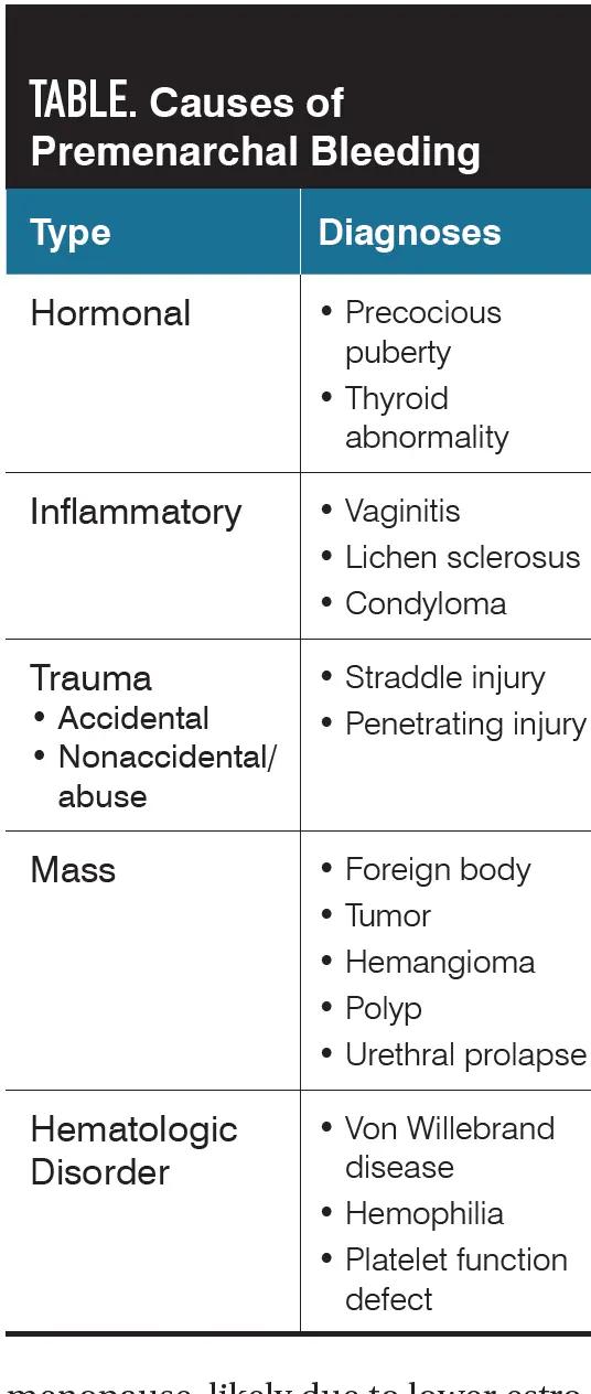 The differential diagnosis list for premenarchal vaginal and vulvar bleeding is long (Table), with trauma and precocious puberty as the diagnoses that initially need to be ruled out. Vulvar concerns and urologic factors are the most encountered etiologies.8