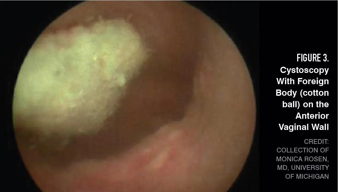 If an office exam is not desired, pelvic imaging can be obtained, although this does not always show the foreign body.14 A vaginoscopy under general anesthesia using a pediatric cystoscope can be performed to better visualize the vagina and the foreign body. With vaginoscopy, the labia majora can be held closed to allow for vaginal distension and better visualization. Common culprits are toilet paper or cotton balls (Figure 3).