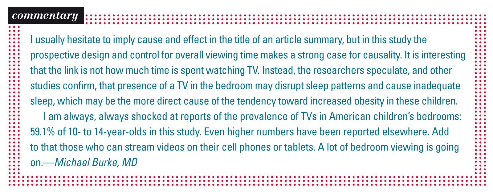 At the 2-year follow-up, those having a bedroom TV at baseline had a mean 1.16 larger BMI than those without a bedroom TV. At year 4, the comparable figure was even larger-1.31. Even after adjusting for time spent watching TV and movies, playing video games, and parenting style, having a bedroom TV was associated with an excess BMI of 0.57 at year 2 and 0.75 at year 4, and a BMI gain of 0.24 from years 2 to 4. Each hour per day of TV viewing at baseline also predicted a mean excess BMI gain of 0.14 (Gilbert-Diamond D, et al. JAMA Pediatrics. 2014:168[5]:427-434).
