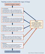 In the context of smoking cessation, the goal of structured counseling is to guide a smoker through six stages of changeprecontemplation, contemplation, preparation, action, maintenance, and terminationin a stepwise manner. Counseling focuses on helping a precontemplator become a contemplator, a contemplator become a preparer, and so on until the smoker enters the termination stage and no longer perceives any cues to smoke. The flow chart "Smoking cessation: A model of the stages of change," illustrates this process.12,13