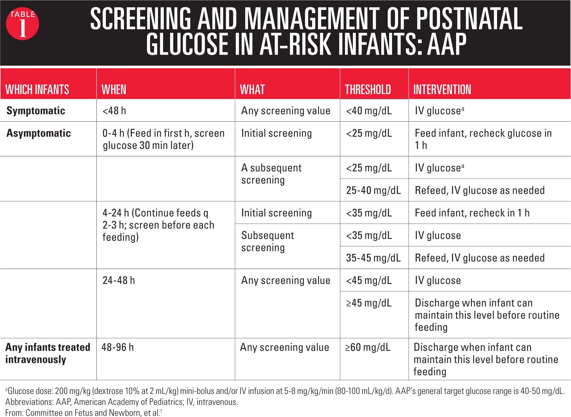 Thus, AAP authors conclude that sticking with this group's recently reratified 2011 recommendations, "along with enhanced vigilance to identify persistent hypoglycemia symptoms after 48 hours, might be the best compromise" to prevent overscreening and overtreatment while still committing to diagnosing persistent hypoglycemia after the transitional period, but before infants are discharged home.3