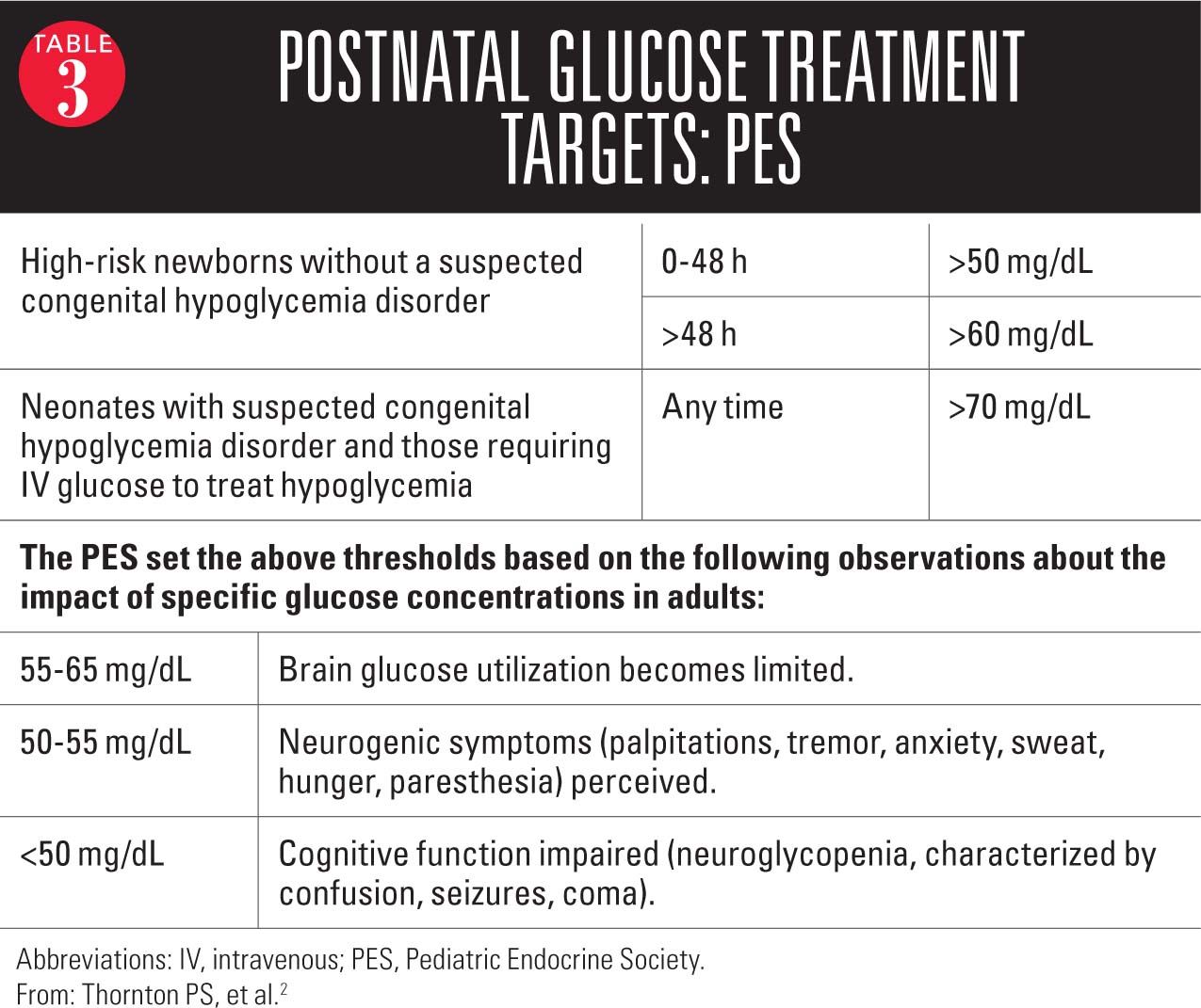 The PES guidelines differ in that they expand the list of whom to screen and recommended that the target for treatment (not screening) in these at-risk babies is 50 mg/dL if being treated by feeding and 70 mg/dL if treated by intravenous (IV) glucose (Table 2).2