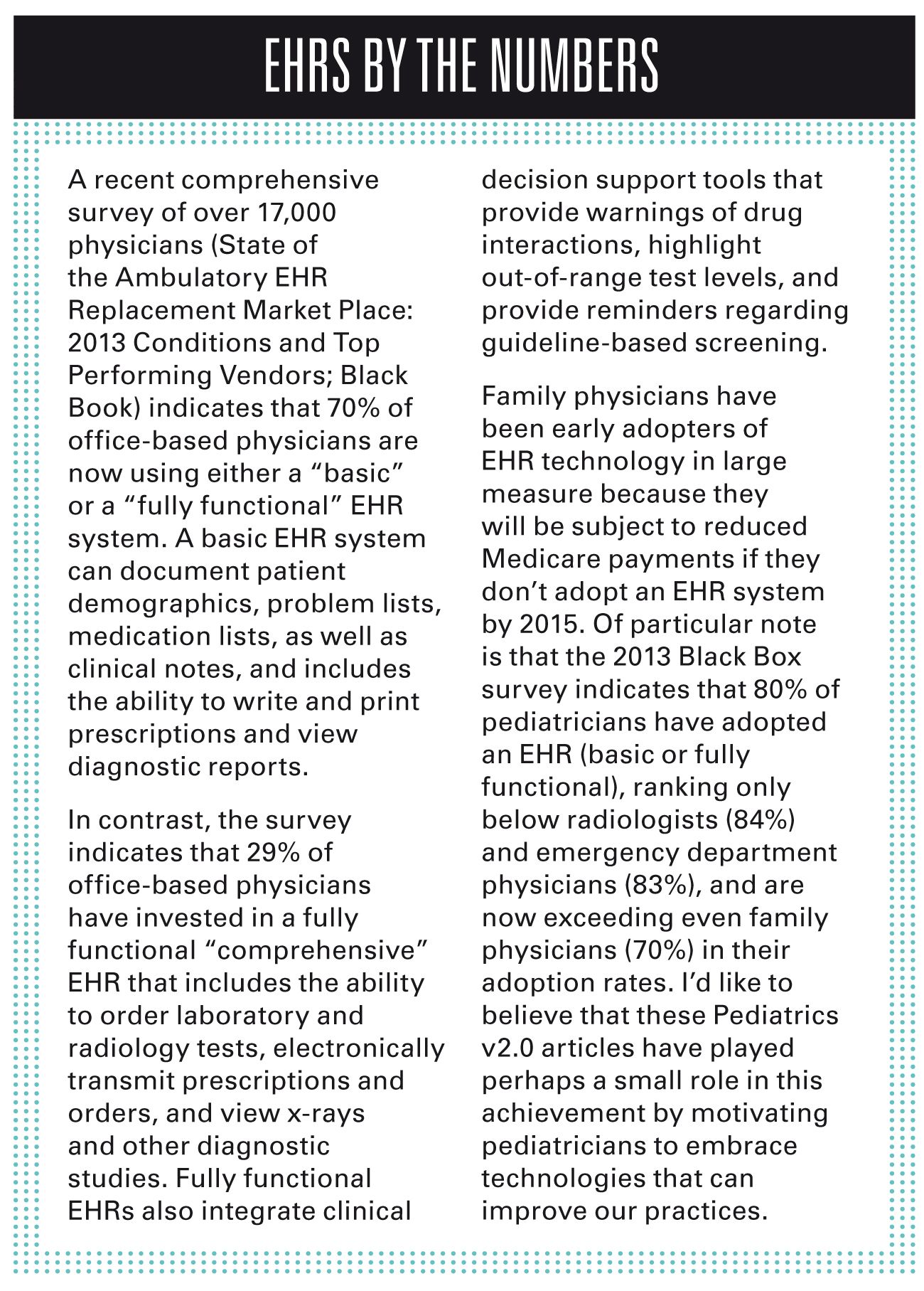 If, after everything is said and done, you have made the decision to migrate to a new system, the most difficult decision is which EHR to select. Consider a pediatric-specific EHR such as Office Practicum (Connexin Software; New York, New York) or the Physician’s Computer Company’s EHR (Winooski, Vermont). Seek opinions from other pediatricians using EHRs by joining the American Academy of Pediatrics Section on Administration and Practice Management and enrolling in its listserv. You can also be guided by current surveys and ratings and choose an EHR that has been successful in the marketplace and well rated by physician users.
