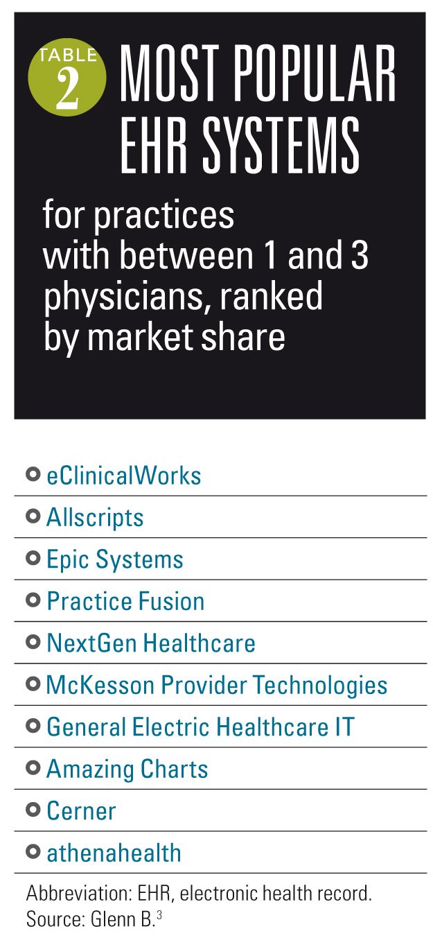 Medical Economics, the sister publication of Contemporary Pediatrics, recently dedicated an entire issue to the top 100 EHRs (October 2013) and is well worth your review. According to an article published July 8, 2013, on the Medical Economics website, just a handful of EHRs have proven to be the most popular among physicians in small practices.3 These are listed in Table 2.
