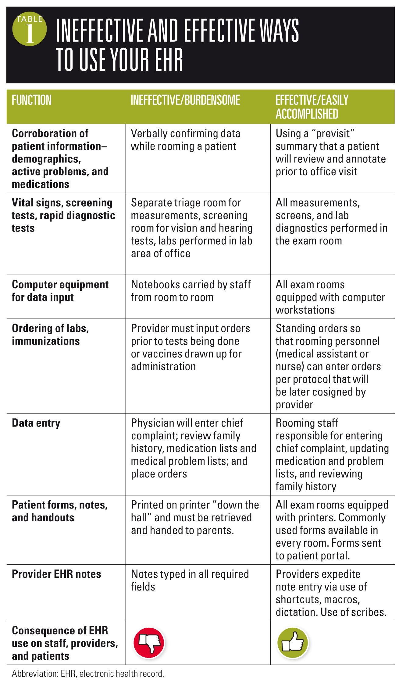 The ergonomics of your exam rooms have an immense impact on how you use your EHR (Table 1). In my opinion, the most efficient setup of an EHR involves workstations in each exam room, positioned strategically so you can view parent and patient while inputting information into the EHR. Having a workstation with a computer stand, comfortable seat, large screen, mouse, and keyboard makes it easy to input information. Better yet, have a printer in each exam room, so that you or the nurse or medical assistant who rooms your patient can provide school notes, physical forms, and instructions without leaving the room to retrieve them from the printer down the hall.