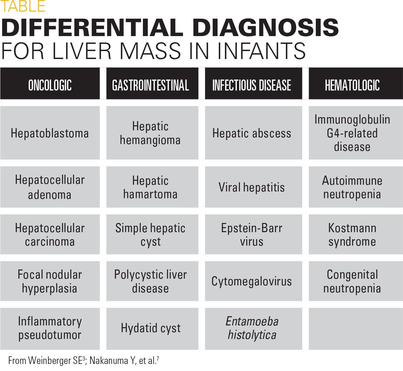 For any child who presents with a liver mass, benign or malignant tumors are highly suspected, with malignant tumors being most concerning and requiring prompt evaluation. Hemangioma and hamartoma are the most common liver masses in infants aged younger than 1 year. These lesions often are visualized on abdominal ultrasound, CT, or magnetic resonance imaging (MRI). Hepatoblastoma and hepatocellular carcinoma also are on the differential, which requires a confirmatory biopsy when the patient is clinically stable. Additional imaging may be warranted if there is concern for metastatic disease.